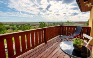 Házunk alsó szintjét párok, nászutasok számára alakítottuk ki. A nagyra nyitható erkélyajtónak köszönhetően az ágyból is csodálható a mesés panoráma.